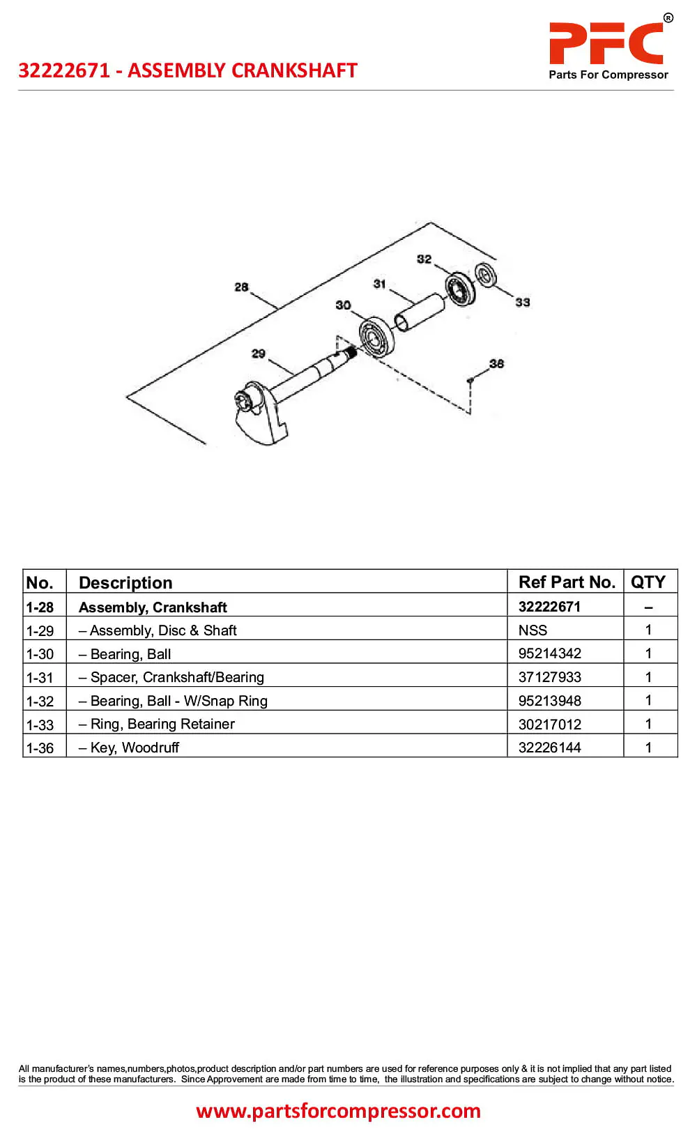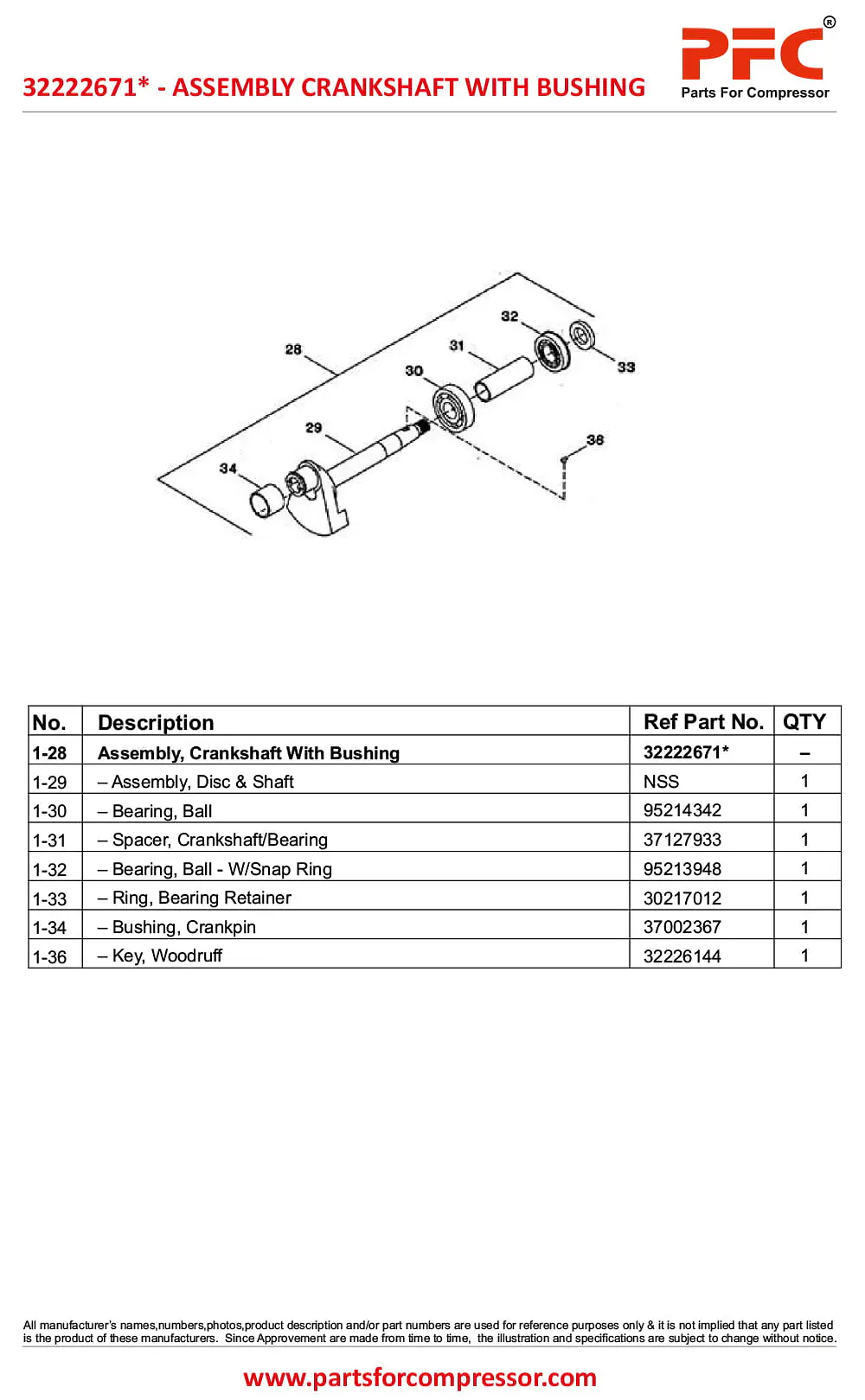 PFC - Parts for Compressor is a global supplier of OEM Quality New Aftermarket Replacement Air Compressor Spare Parts - Crankshaft Complete with Bushing 32222671* for Ingersoll Rand Air Compressor - Type-30 from India