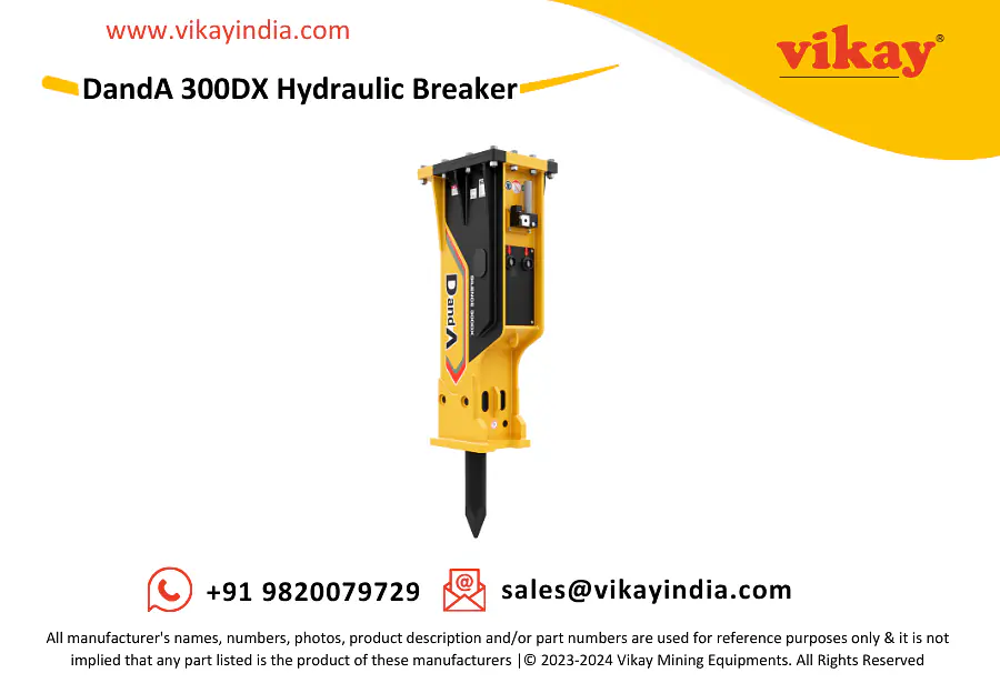 Vikay is a worldwide distributor of DandA 300DX Hydraulic Breaker - 300DX suitable forexcavators of 25 - 36 ton (55116 - 79366 lbs), used in demolition, renovation, trenching etc from India.