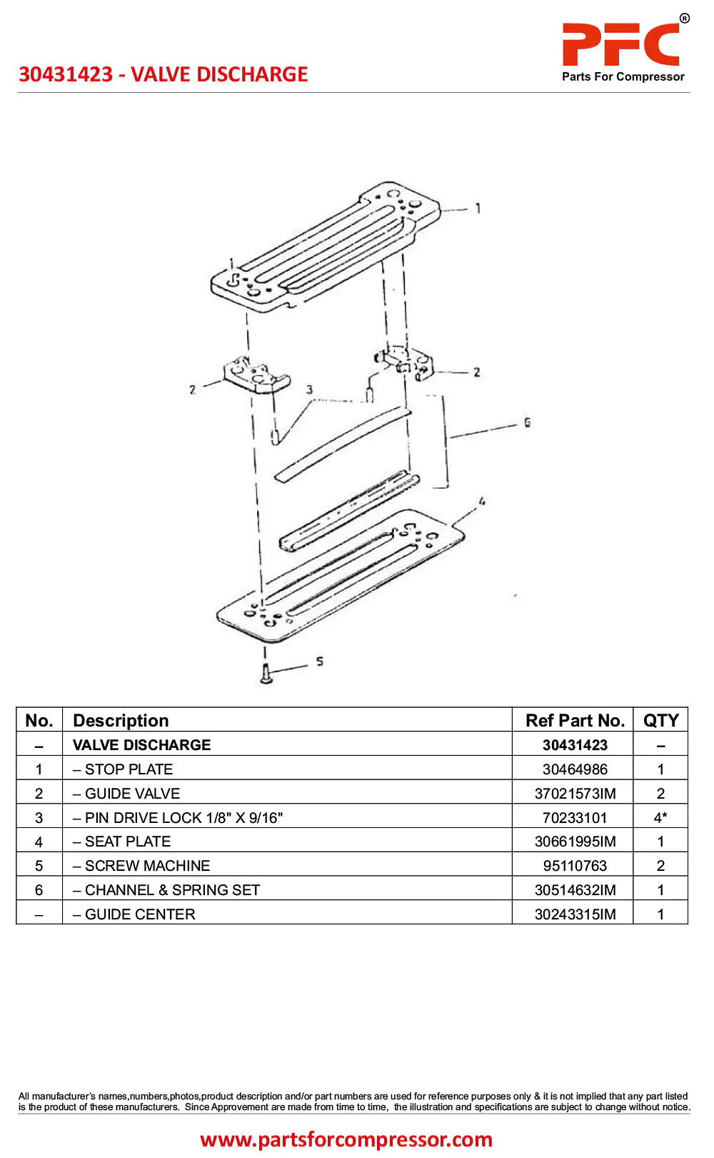PFC - Parts for Compressor is a global supplier of OEM Quality New Aftermarket Replacement Air Compressor Spare Parts - Valve Discharge 30431423 - Model 9 1/2 x 5 ESV 1 LUB for Ingersoll Rand Air Compressor - Type-Esv/Esh from India.