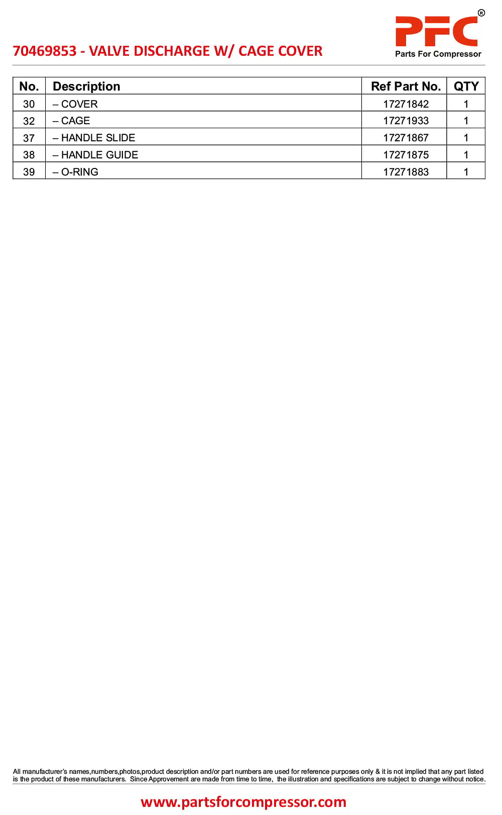 PFC - Parts for Compressor is a global supplier of OEM Quality New Aftermarket Replacement Air Compressor Spare Parts - Valve Discharge W-Cage Cover 70469853 for Chicago Pneumatic Air Compressor from India.