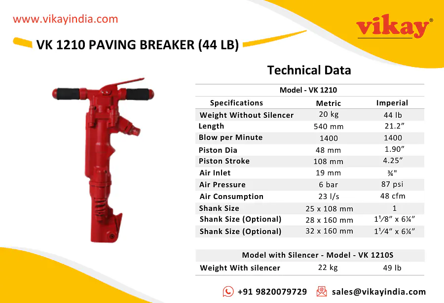 Vikay is a worldwide distributor of VK 1210 Paving Breaker-44lb - CP 1210 - technically equivalent to CP 1210 Pneumatic Breaker suitable for light to medium construction and plant maintenance work from India.