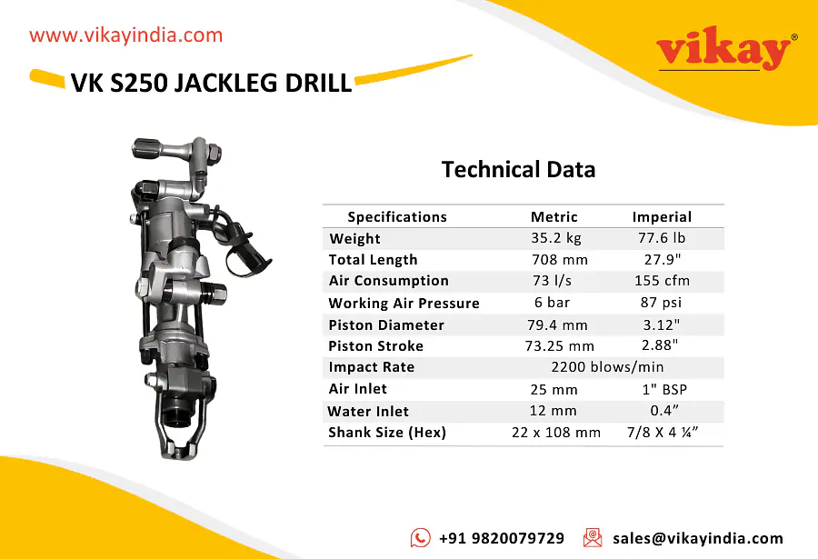 The VK S250 Jackleg Drill technically equivalent to Boart Longyear S250 Jackleg Drill, Secan S250 jackleg Drill has always been the top choice for miners demanding high performance, exceptional control, and long-lasting reliability. The VK S250 jackleg Drill allows operators to drill in confined spaces at challenging orientations while delivering high penetration rate and strong torque even at low air pressure.