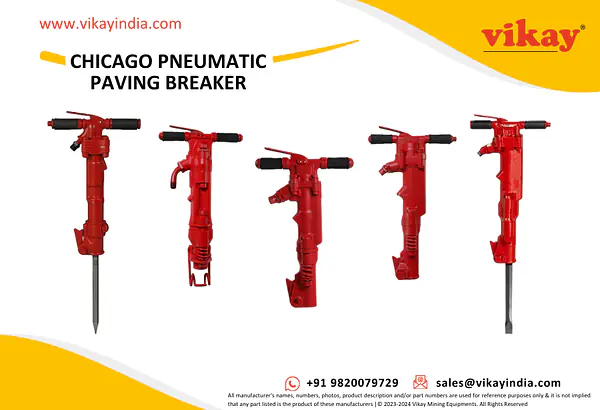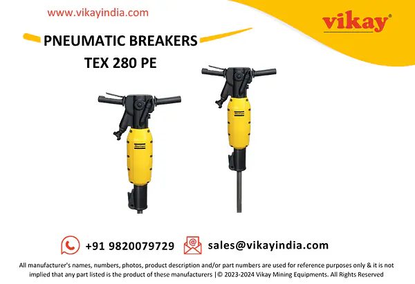 Vikay Mining Equipments is a worldwide distributor of Paving Breaker – RTEX 15 Atlas Copco Pneumatic Breaker, RTEX 25 Atlas Copco Pneumatic Breaker, RTEX 35 Atlas Copco Pneumatic Breaker, TEX 37 Atlas Copco Pneumatic Breaker, TEX 21 PE Atlas Copco Pneumatic Breaker, TEX 33 PE Atlas Copco Pneumatic Breaker, TEX 40 PE Atlas Copco Pneumatic Breaker, TEX 150 PE Atlas Copco Pneumatic Breaker, TEX 190 PE Atlas Copco Pneumatic Breaker, TEX 230 PE Atlas Copco Pneumatic Breaker, TEX 280 PE Atlas Copco Pneumatic Breaker, TEX P60S Atlas Copco Pneumatic Breaker, TEX P90S Atlas Copco Pneumatic Breaker, CP 111 THLA Chicago Pneumatic Paving Breaker, CP 112 Chicago Pneumatic Paving Breaker, CP 117 Chicago Pneumatic Paving Breaker, CP 1210 Chicago Pneumatic Paving Breaker, CP 1230 Chicago Pneumatic Paving Breaker, CP 1240 Chicago Pneumatic Paving Breaker, CP 1260 Chicago Pneumatic Paving Breaker, CP 1290 Chicago Pneumatic Paving Breaker from India.