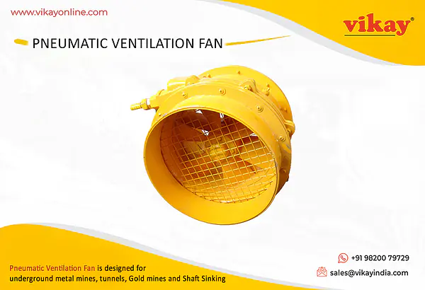 Vikay Pneumatic Ventilation Fan VK-PVF16 used in Underground Metal Mines | Pneumatic Ventilation Fan is designed for underground metal mines, tunnels, Gold mines and Shaft Sinking, to remove Blasting Fumes very quickly and deliver fresh air into the mines. Over all weight 25 Kg. completely balanced to run at 4000 RPM. Fitted with precision ball and roller bearing for long life.